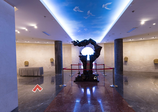 著名雕塑家蒋铁骊先生精心创作了以“战争与和平”为主题的主题雕塑。头盔、军号、钢枪等战争元素演变成只巨大的和平鸽,和平鸽的羽毛上生长出橄榄枝,同时孕育出小和平鸽,从而表达了告别战争、珍惜和平的美好愿景。