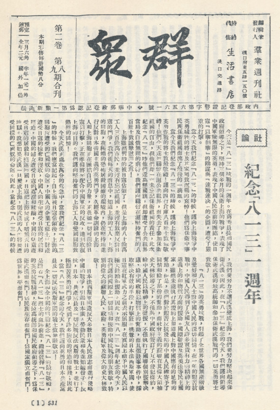 1938年8月13日,汉口中共机关刊物《群众》周刊刊登了纪念八一三淞沪抗战一周年的文章,并向“八百壮士致敬 。