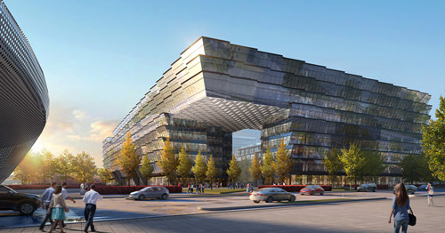 以律动绿洲为设计理念,打造千米连续律动募墙,以权威绿色建筑标准,构建可持续办公模式。