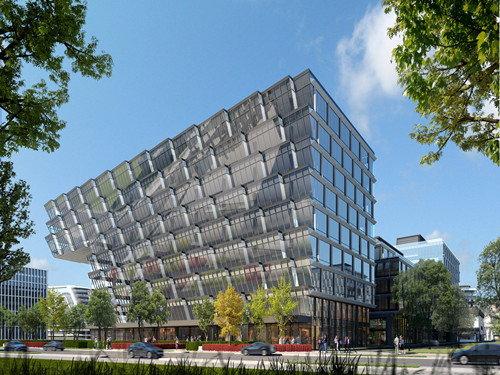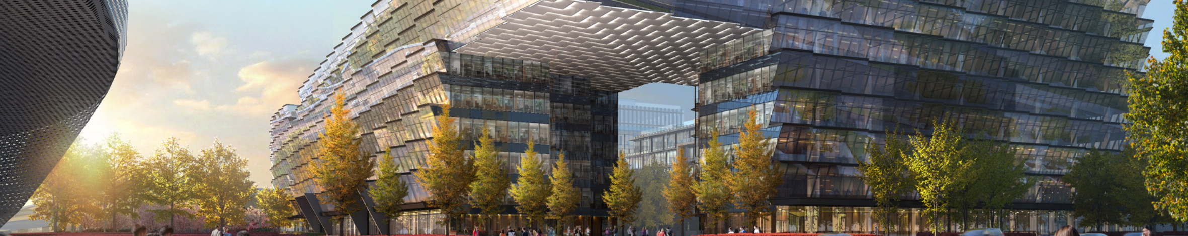 以律动绿洲为设计理念,打造千米连续律动募墙,以权威绿色建筑标准,构建可持续办公模式。