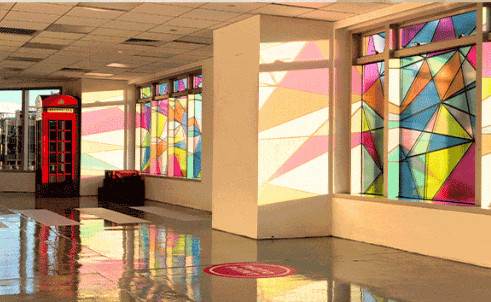 再抬头看,四周的窗户上也藏着故事,透明窗贴勾勒出上海大剧院、音乐厅、上海力宝广场等著名建筑的轮廓;