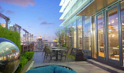摄像师用广角镜头记录下这片 “城市绿洲”,蓝天、楼宇与绿植构成的画面,恰是“在繁华中寻静谧,在高效中享舒适” 的办公哲学缩影。