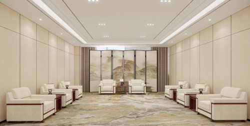 接待室遵循开阔原理,却颇有些山水意趣。大面积具有吸音功能浅米色的硬包墙面运用,积淀空间沉着而端雅的基调,定制纹理地毯及屏风上下勾连,似如一面巨幅山水画飞纵其间,软装家具及构件营造色调深浅交映的同时,向访客娓娓述说中式接待场所的典雅与浪漫。