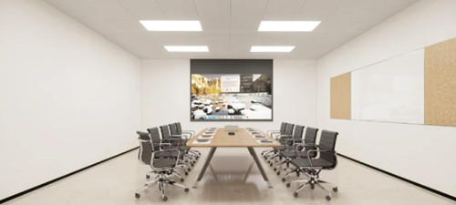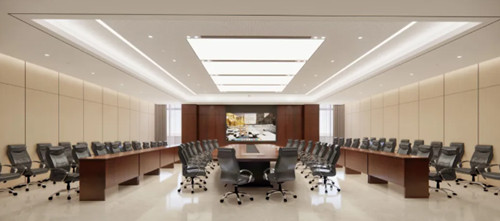 大会议室采用经典U字形布局,由中轴向两旁排列扩散,深浅分明的色调交织在一起,延展出秩序与井然之外的成熟和稳重。在议会空间的纯粹与兼容之间,吸音硬包墙面守候着每一个新的创享,为空间体验与实用性写下坚实注脚;全套灯光照明系统投射出温润光影,保留原有容积的同时提升整体空间感,让视觉的延伸更为壮阔。