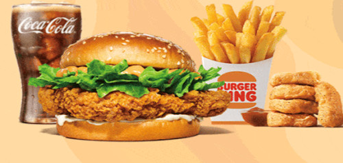 28.9元脆辣皇金鸡腿堡四件套:脆辣皇金鸡腿堡+王道嫩香鸡块(5块)+薯霸王(中)+可可乐(中);
