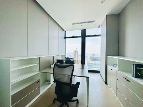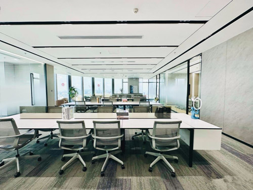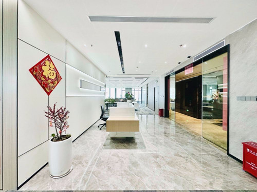 装饰风格:前海周大福金融大厦出租办公室装修精美、三层玻璃落地窗、全进口自动窗帘,隔间、吊顶、前台、地毯等等这些都是由深圳办公室装修公司设计的。