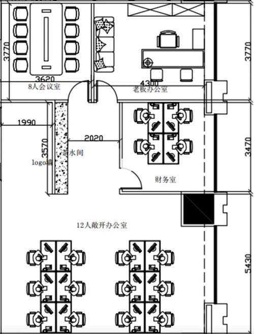 第一张A户型图是一加四的格局,最大的老板办公室有20平的面积,其他三个房间也在十二三平左右,敞开办公区坐下12个人之后,还挺宽敞的,这个看完了,我们看下面第二个户型图。
