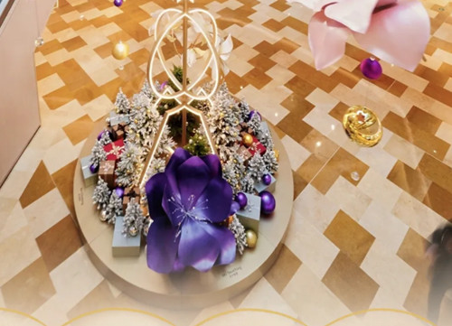 以上海与巴黎的地标性建筑为灵感打造光影装置,东方玉兰与法式鸢尾;