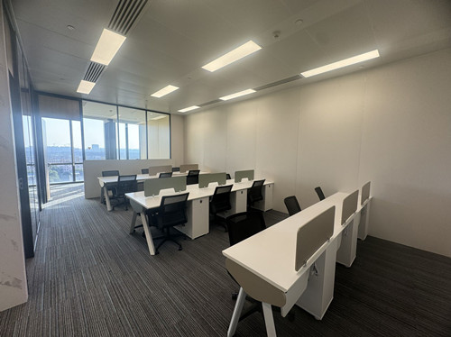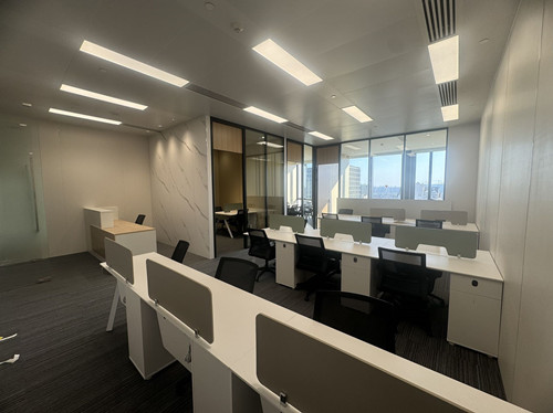 交付标准:吊顶:金属铝板配标准灯盘及LED模组(500lux);架空地台:150mm架空地台板配标准地插盒;空调:VRV(独立计量)