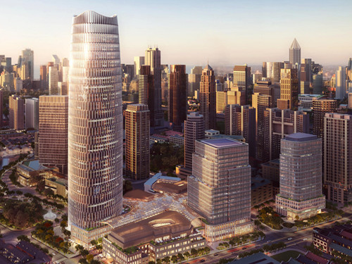 塔一大厦:太平洋新天地T1大厦是一座250米超高层超甲级写字楼,于2023年5月18日封顶。其外立面幕墙菱形结构以石库门为设计原型,每片4米高、共计千余片立体成形的“石库门”饰面呈现出现代工艺的巧思。步入大堂,背景主墙除延续石库门经典元素外,还汲取东台路在地文化的灵感,以融合手工艺制造的传统技艺,设计打造具有独特纹路的陶板。