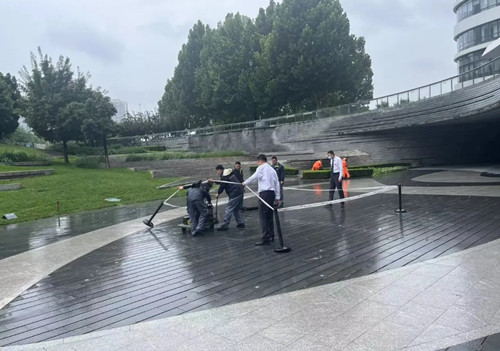 实时巡查广场地面、停车场坡道及楼顶平台是否积水,对排水异常的管道等进行修复,以防暴雨天气雨水倒灌。