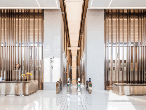 整体风格:BFC外滩金融中心大堂设计融合了现代与经典元素,该上海办公楼出售房屋采用石材、金属、玻璃等材质,营造出高贵稳重又不失现代的典雅氛围。
