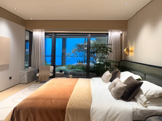 最后呢,还有我们的第四个房间,可以简单的来看一下。这个房间啊,它既然是一个拐角,你可以看到,而且它的拐角是没有立柱的,整个景观就非常的通透。而且呢,它是一个大的套房间,功能性非常足。