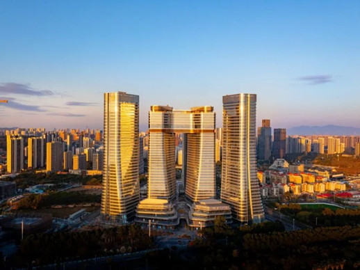 特点:由两栋超甲级写字楼与配套商业裙楼组成,总建筑面积逾十万平方米。外立面采用LOW-E中空玻璃幕墙与流线型铝板结合设计。大堂挑高12米,标准层办公空间无柱化设计,单层面积可从200平方米至2000平方米灵活分割,层高4.2米搭配架空地板系统。配备12部高速锋速电梯,地下三层智能车库提供超800个停车位,并引入AGV机器人停车技术。全楼采用VAV变风量空调系统,搭配PM2.5新风过滤装置,还搭载了物联网管理平台,实现全场景数字化管理。